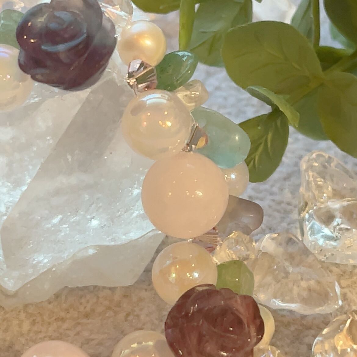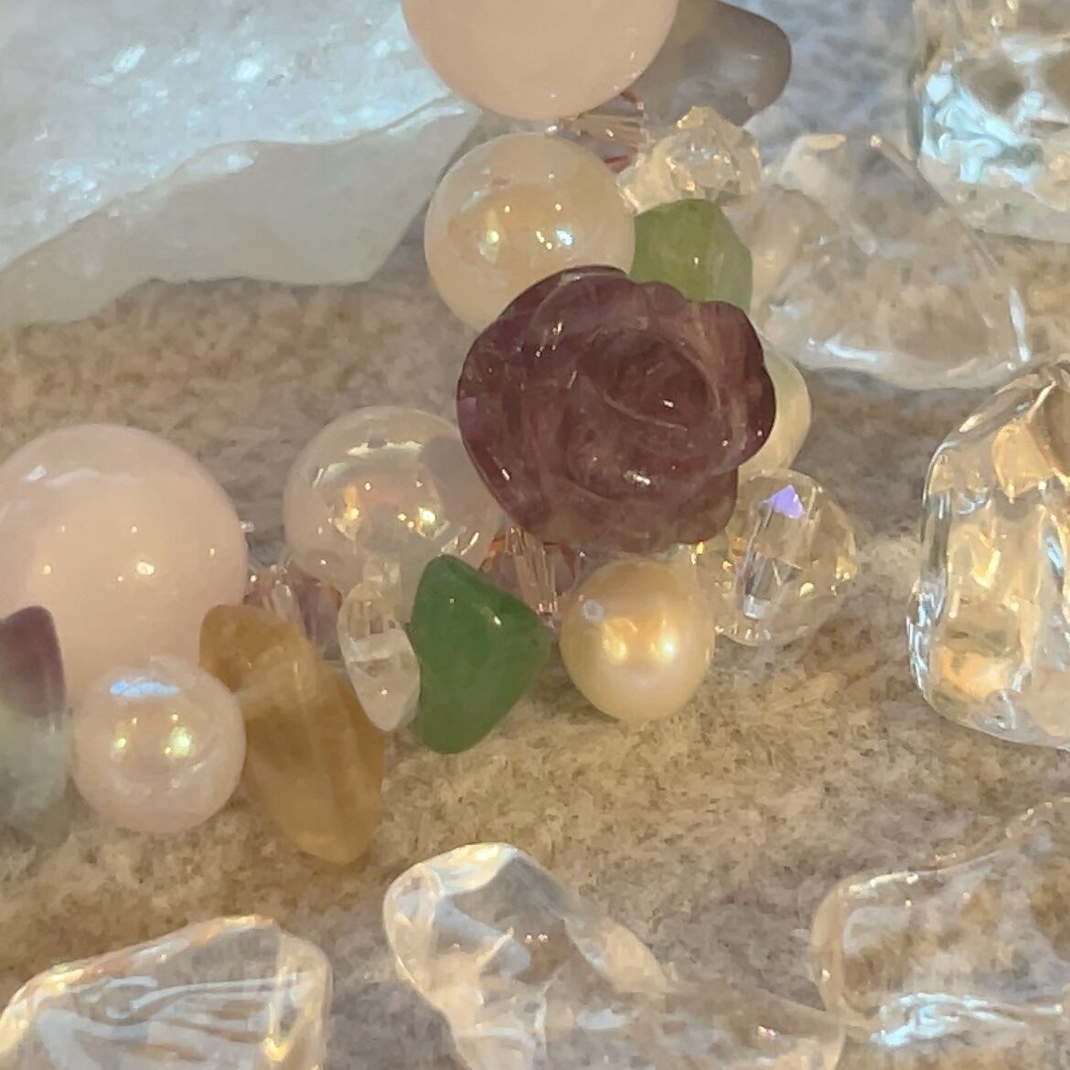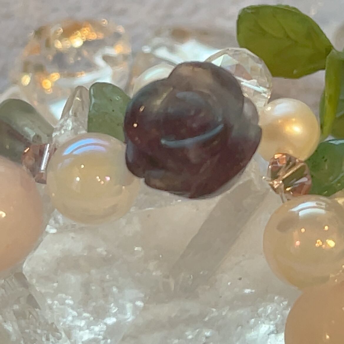 バラ彫刻のフローライトを贅沢に使った、リースのようなデザインブレスレットです。
