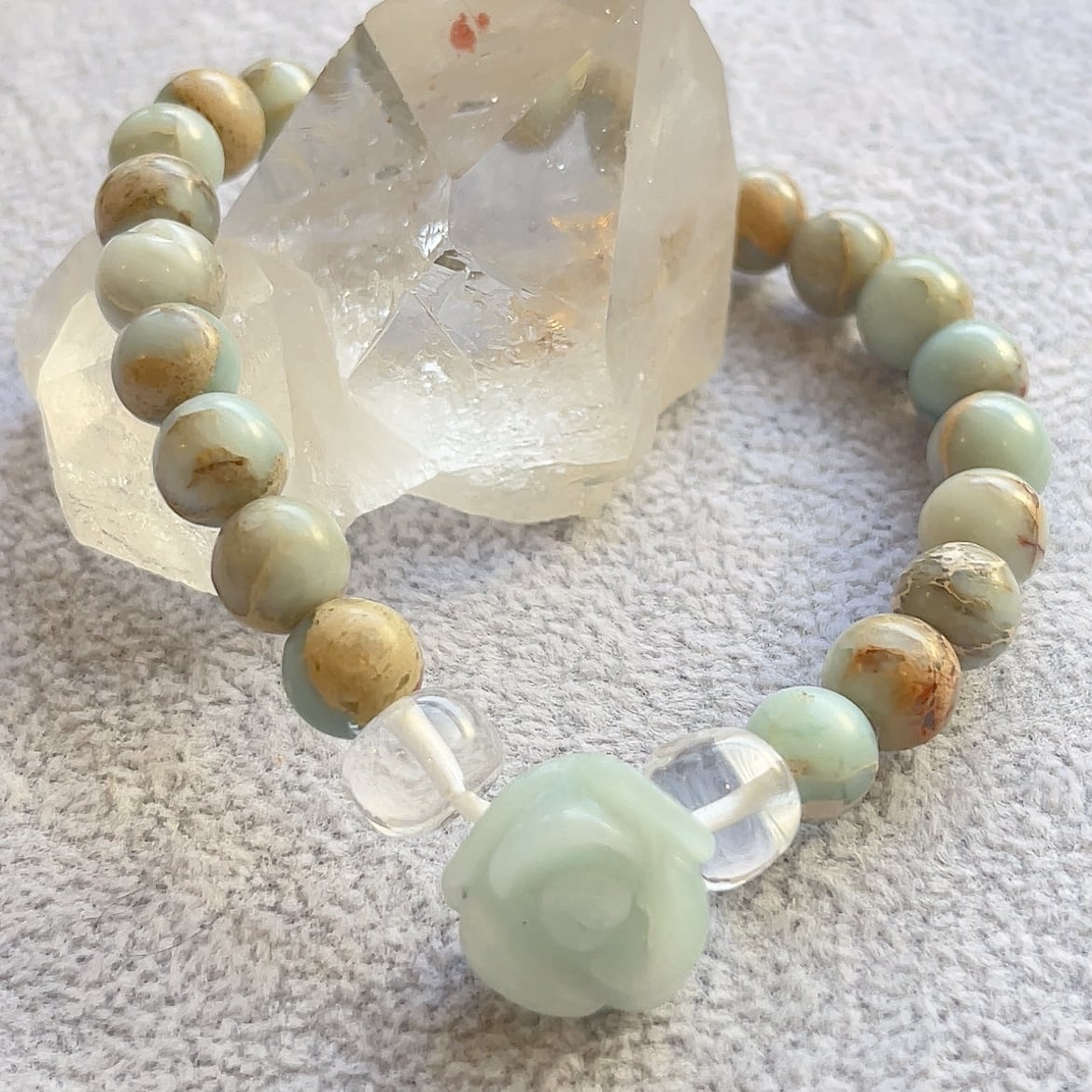 バラ彫刻のアクアマリンを1粒メインに使い、サイドにはヒマラヤパールバティ水晶で挟みインペリアルストーンで組み上げたシンプルなブレスレット。