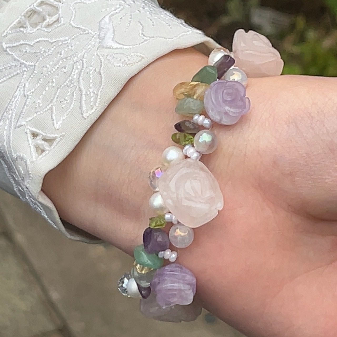 カクッとしたバラ彫りローズクォーツと丸いバラ彫りラベンダーアメジストを並べてリースのように編み上げたブレスレットです。