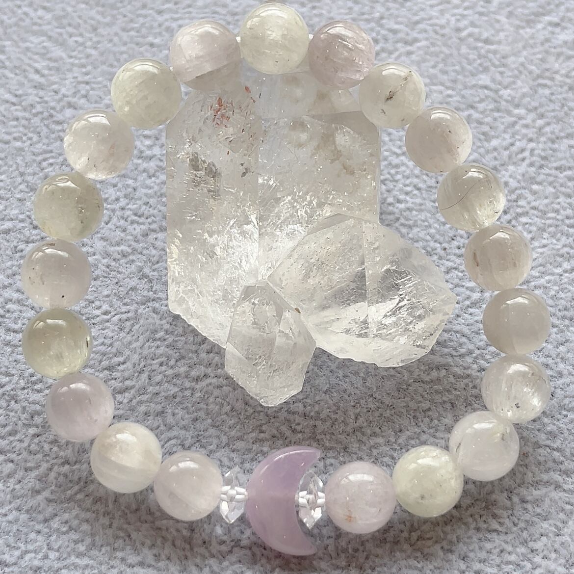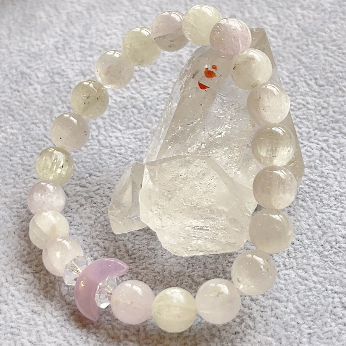 キャッツアイ効果がキラキラと美しいクンツァイトをベースに少しお色が濃いめのこちらもクンツァイトのお月さまをメインに組んだ、デザインブレスレットです。