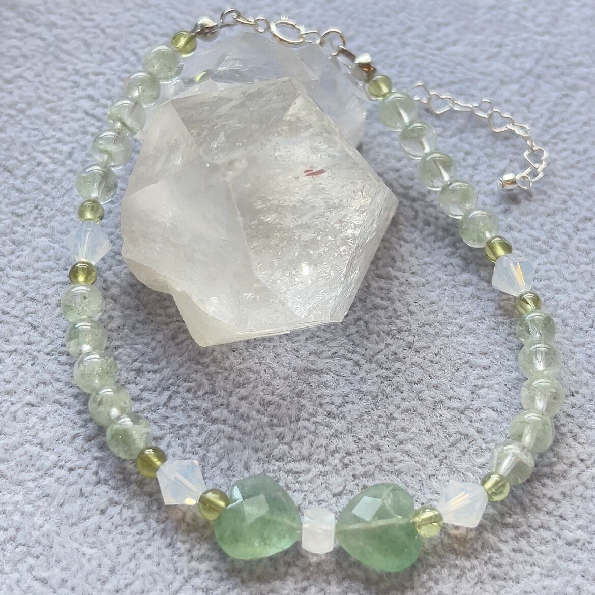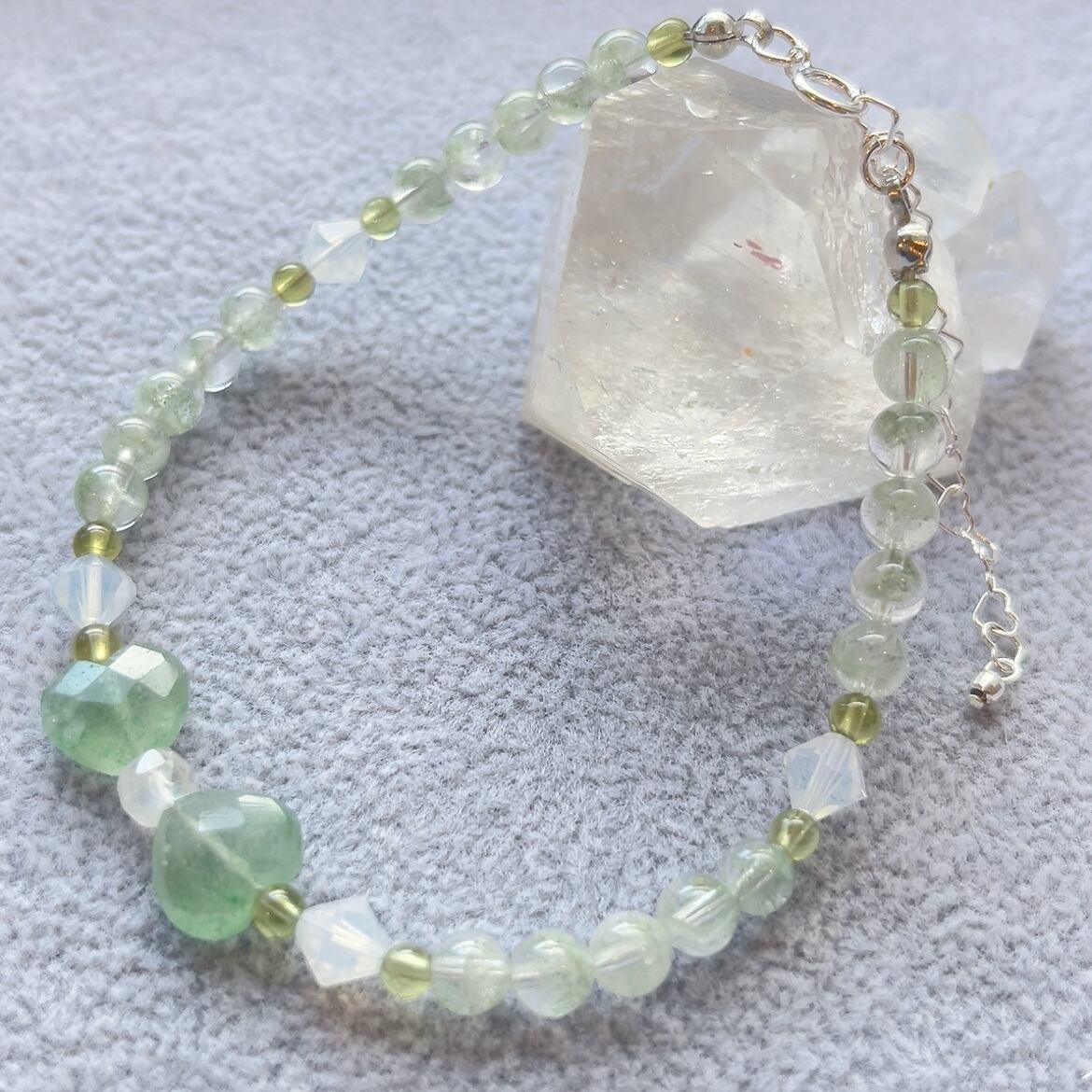 カットグリーンストロベリーハートのリボン★グリーンファントム水晶★パワーストーンブレスレット