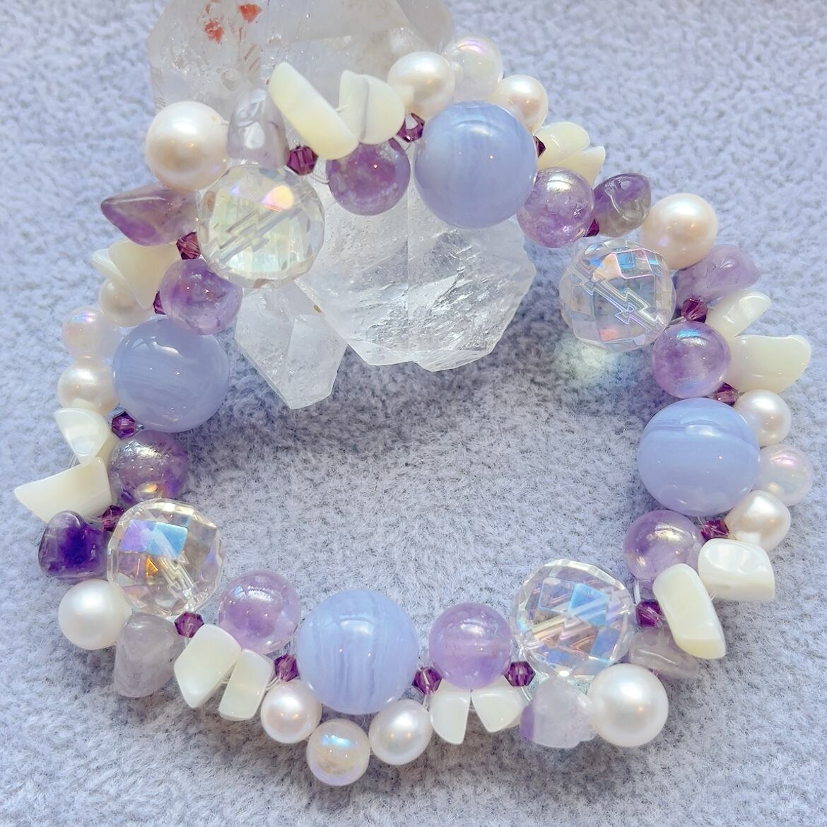 大粒ブルーレースアゲート★オーララベンダーアメジスト★編み込みブレスレット★パワーストーンブレスレット★淡水パール★マザーオブパール