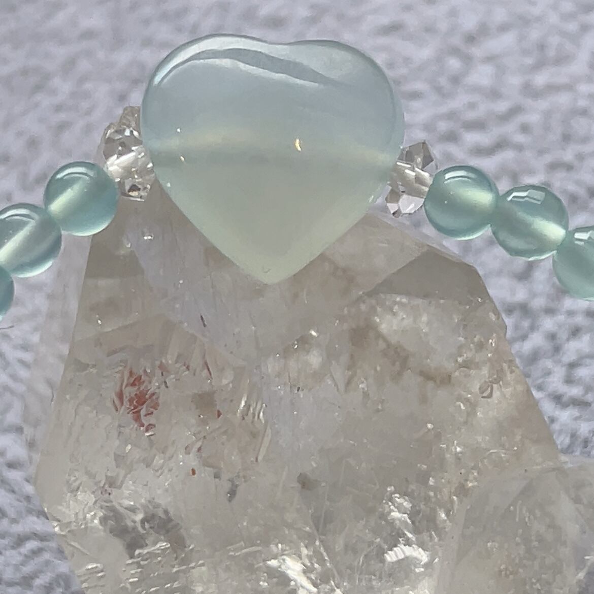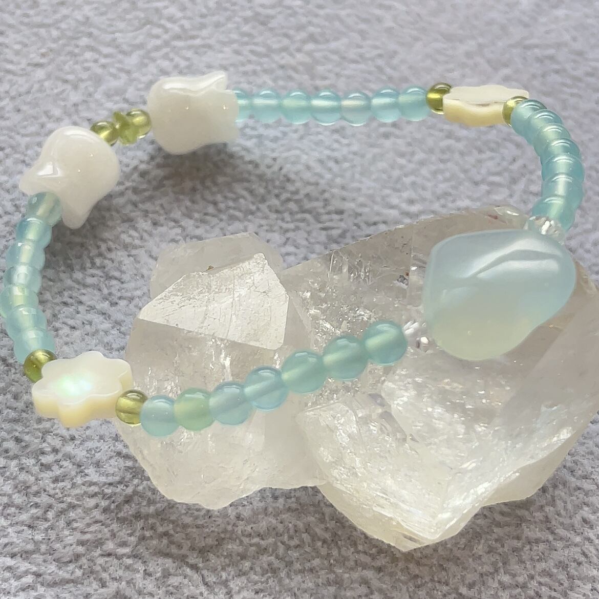 小粒シーブルーカルセドニー★ハートのアクアマリン★マザーオブパールお花★ホワイトカルセドニーすずらん★パワーストーンブレスレット★細身ちゃん