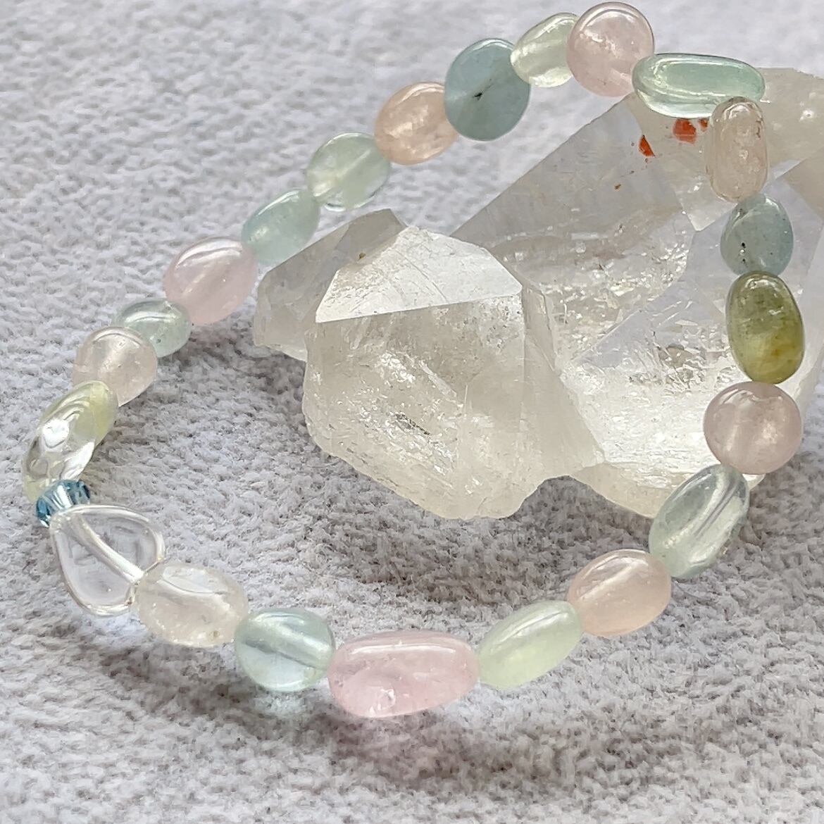 ゼリービーンズみたいなミックスベリルの小さめタンブルと水晶のハートリボンがかわいいデザインブレスレットが出来ました。