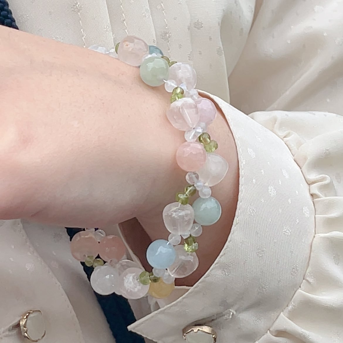 いちご型のセリサイトインローズクォーツとミックスベリルをワイヤーで編み込んだブレスレット。