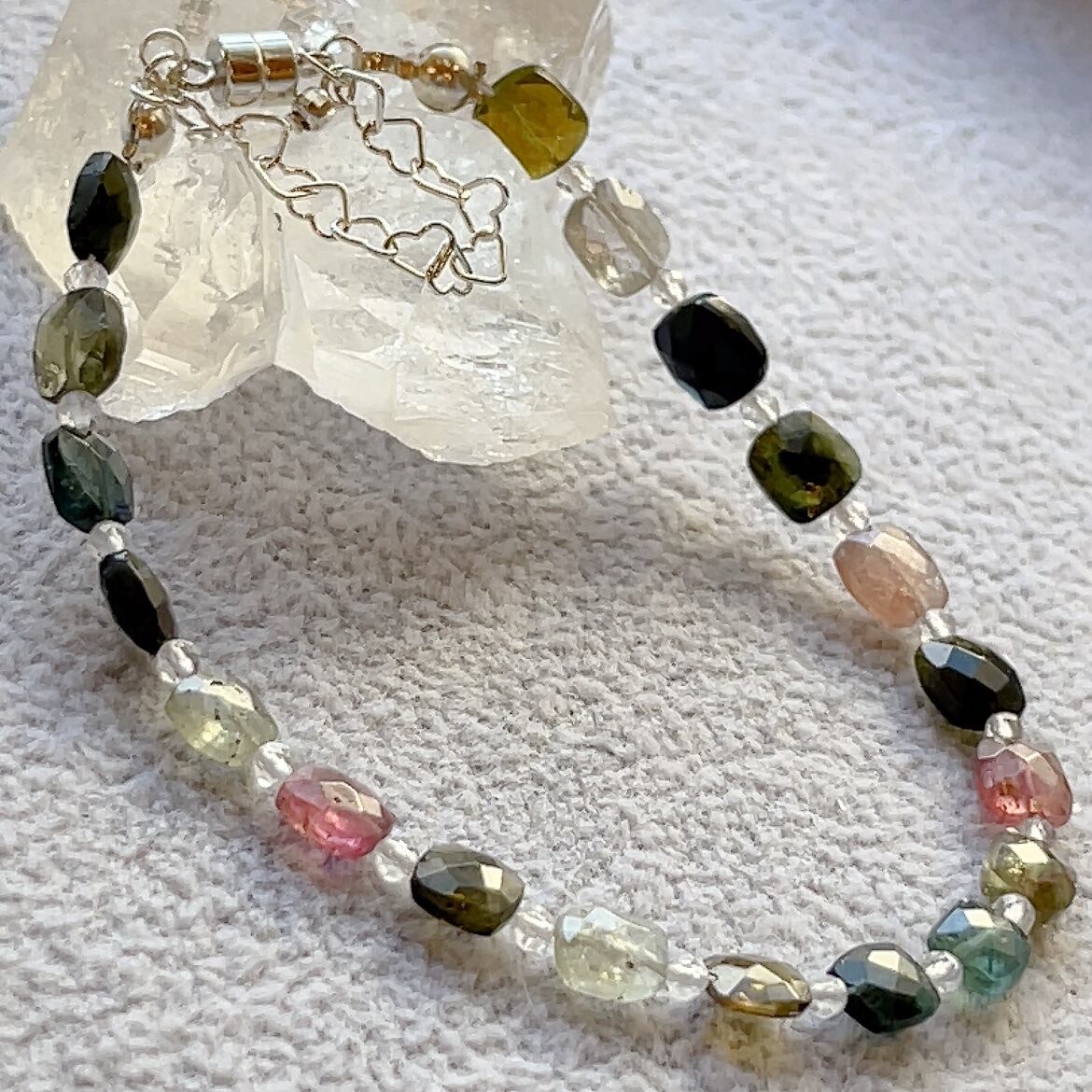 カットでキラキラ美しいカラフルなトルマリンのデザインブレスレット。