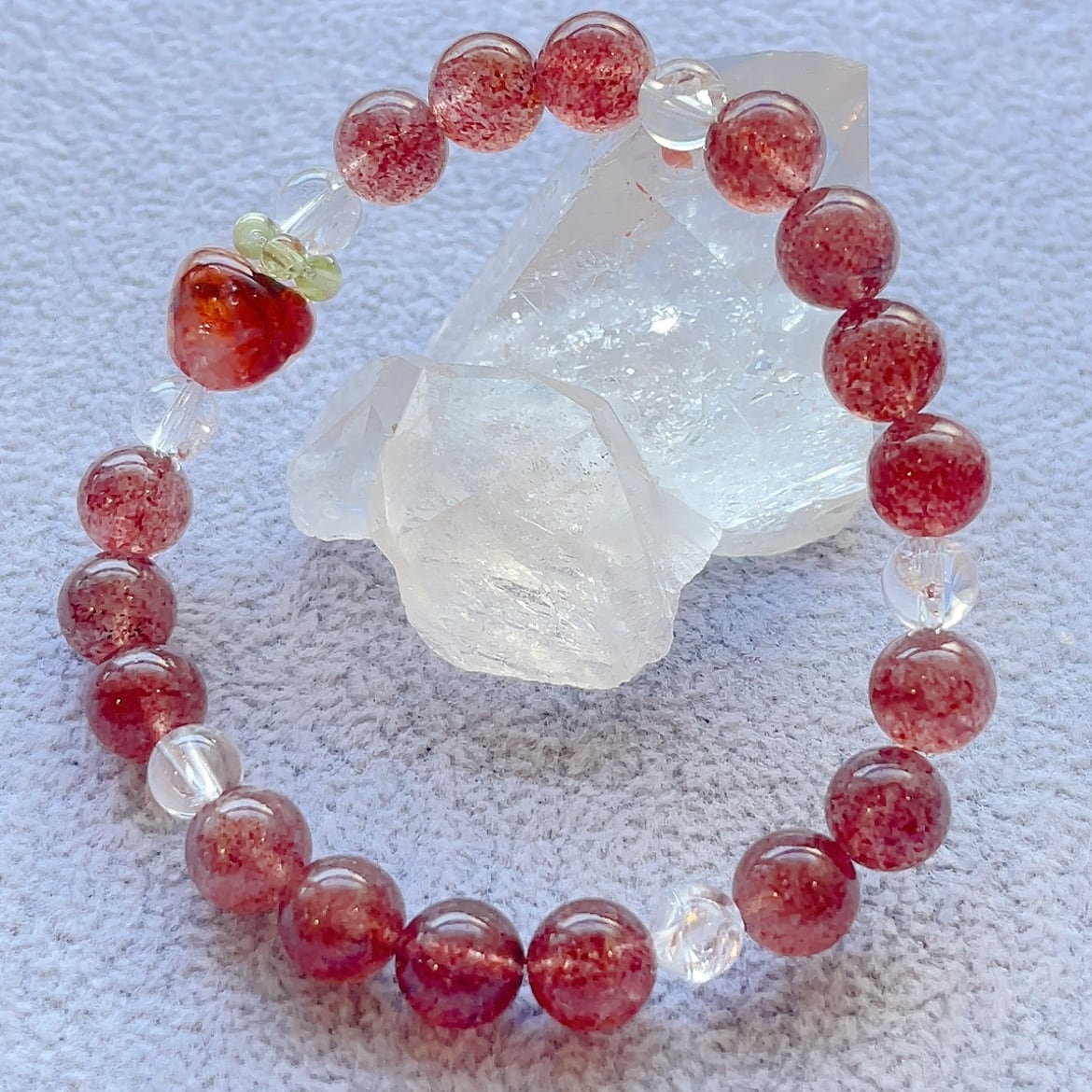 ライモナイトのかわいいいちごちゃんをメインに、アフリカンストロベリークォーツとアイリスクォーツで組み上げた、デザインブレスレット。
