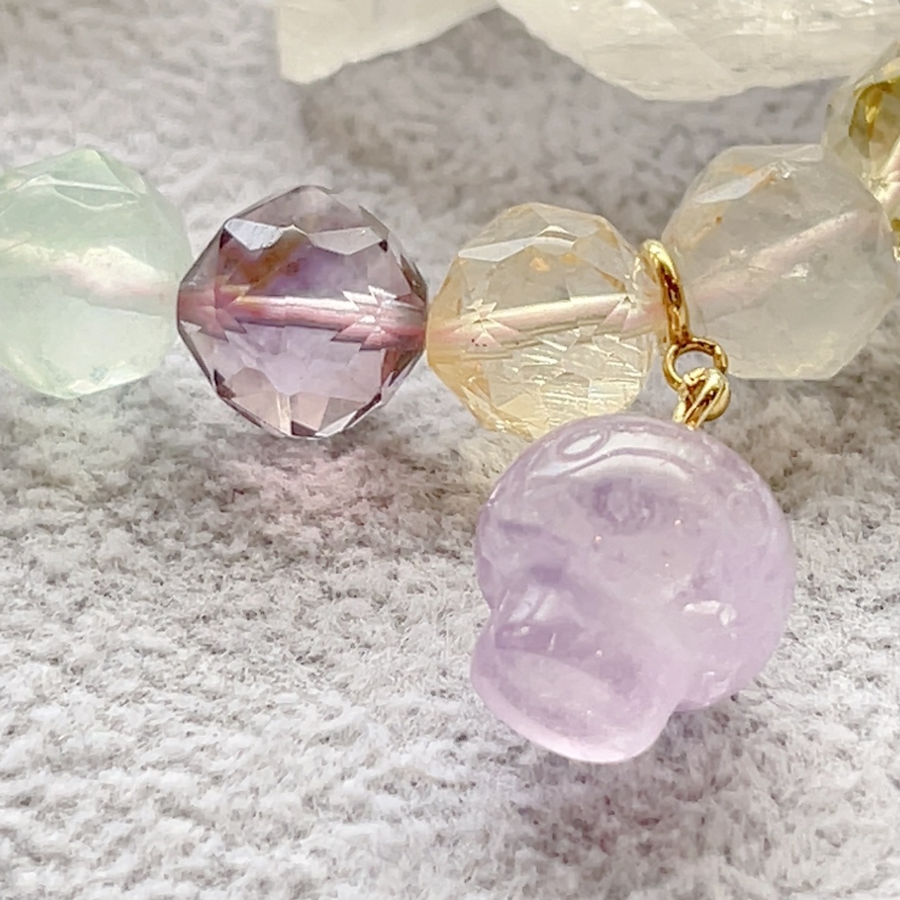 カットが綺麗なカラフルカラーの天然石にラベンダーアメジストのキノコのチャームがかわいいブレスレット。