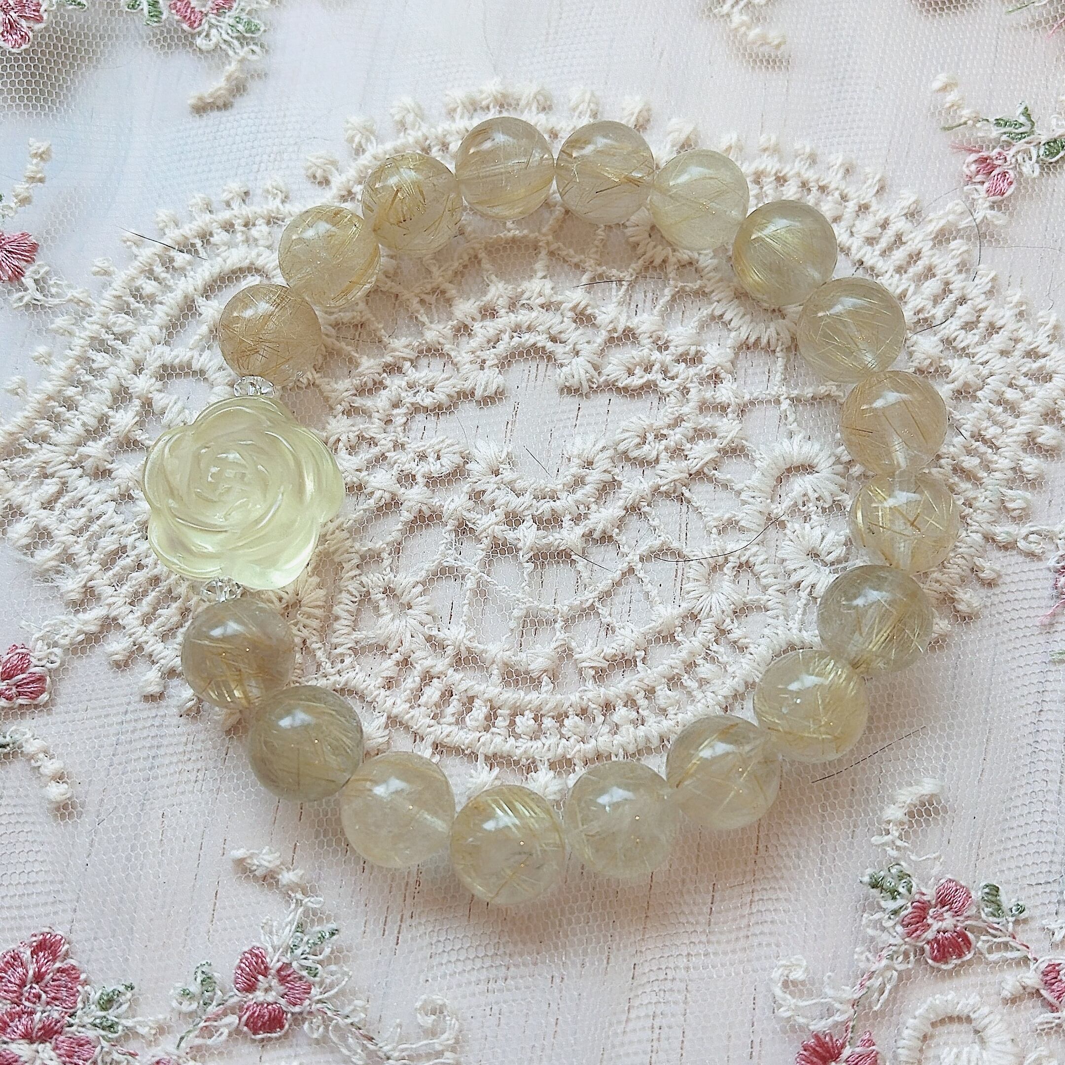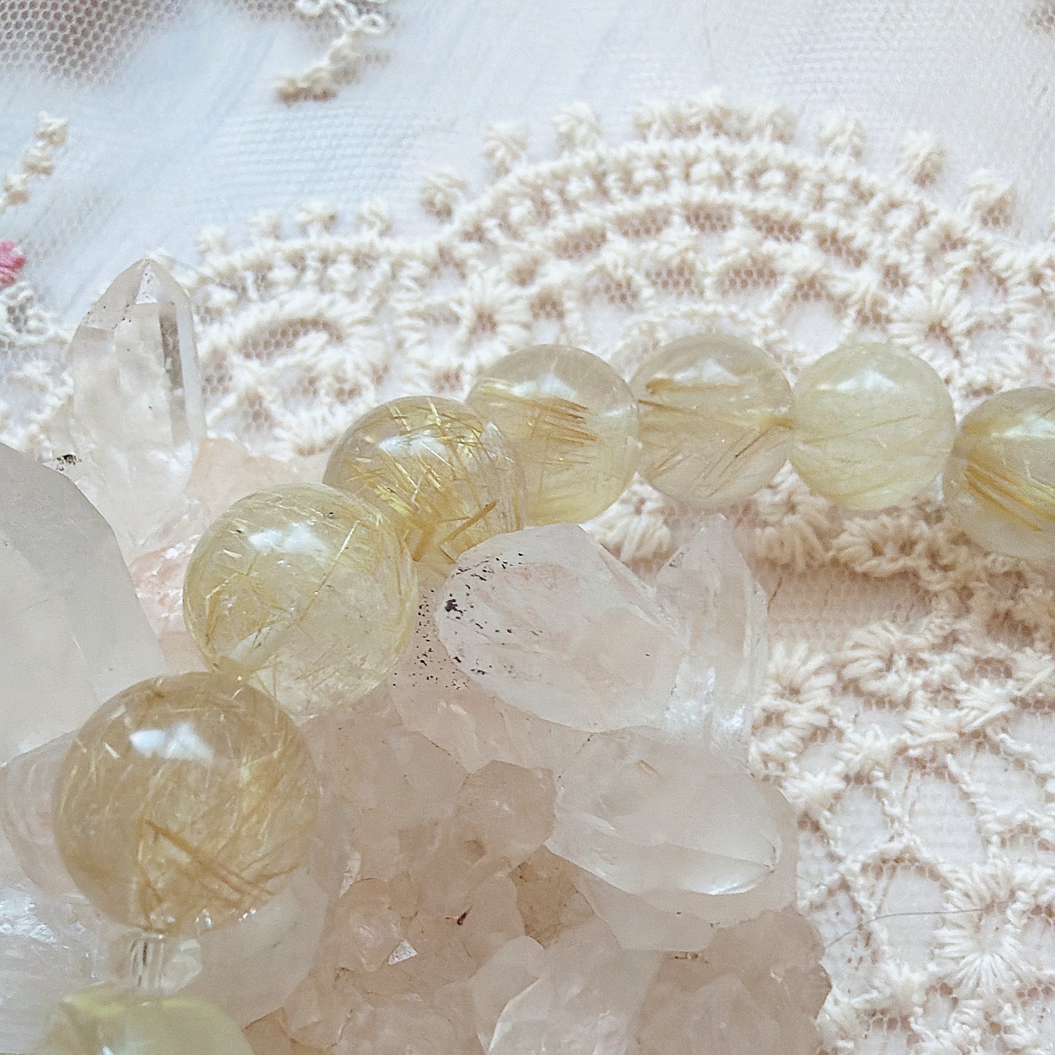 ルチルクォーツそのもののお色や透明感を楽しんで頂くために、透明の糸で組みました。