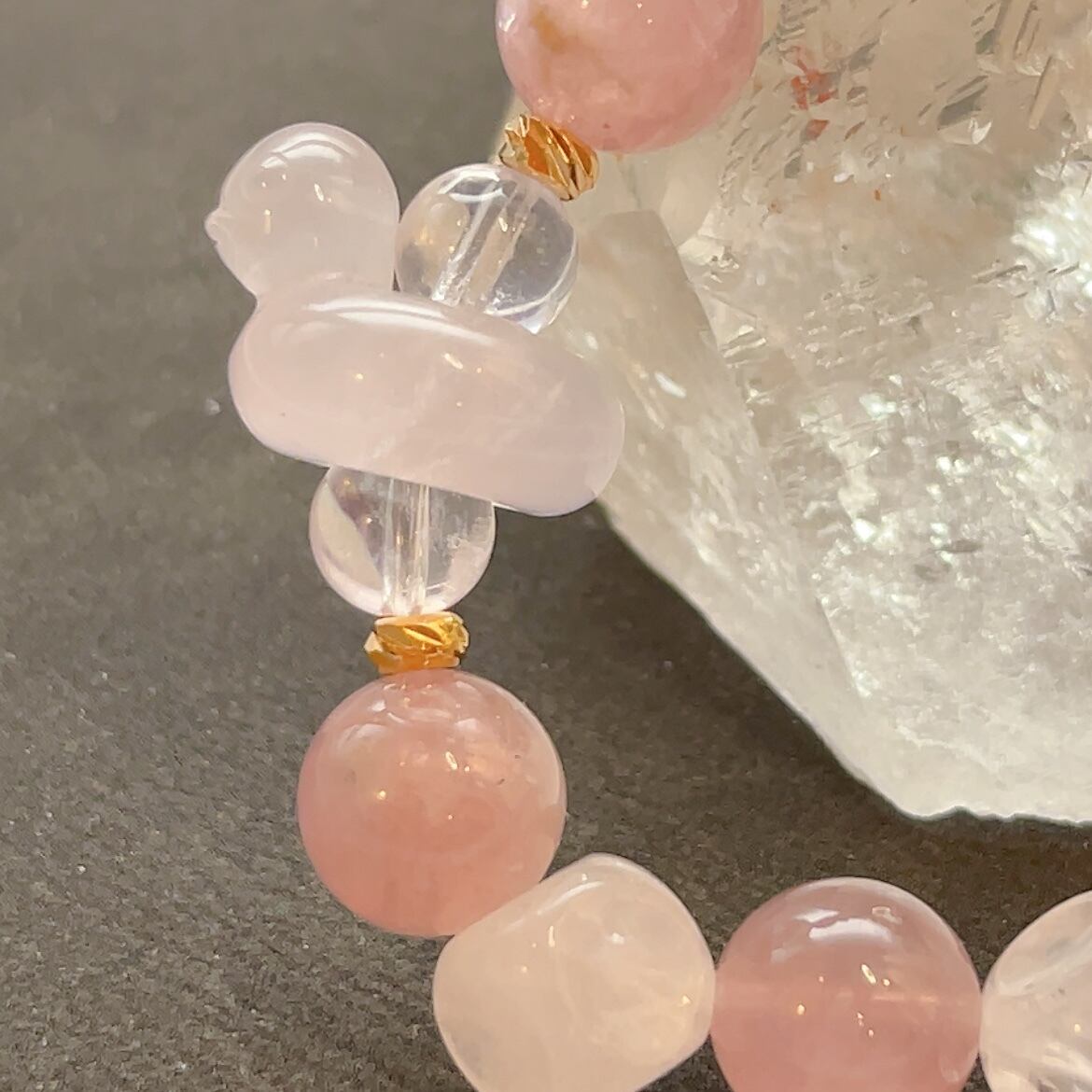あひるのローズクォーツ、スターローズクォーツ、ディープローズクォーツ、キューブローズクォーツの4種のローズクォーツを集めたブレスレット。
