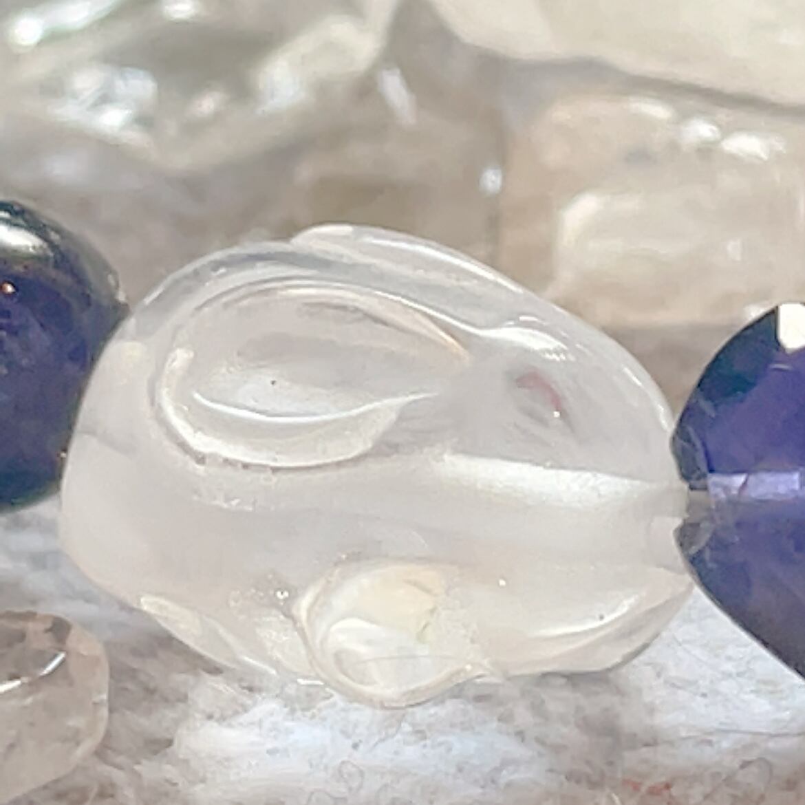 キラキラ綺麗なハートカットの高品質アイオライトを挟んで、ぺたんこうさぎさんが向かい合わせ、うさぎさん以外は、アイオライトで仕上げたデザインブレスレット。