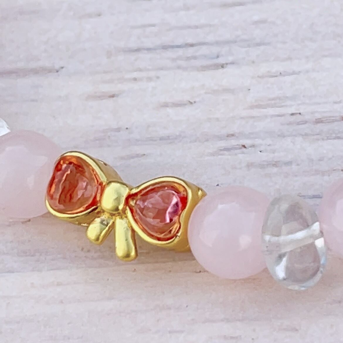 小さなハートリボンとローズクォーツが可愛らしい、天然石のパワーストーンブレスレットです。