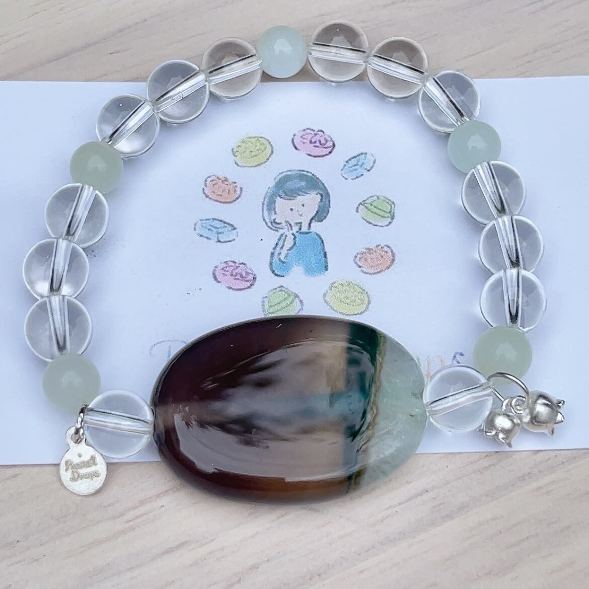 レア★透明感!グレーグリーンドゥルージーアゲート★グリーンオパール★水晶★シルバー925すずらん★パステルオリジナルロゴプレート付き★パワーストーンブレスレット★天然石
