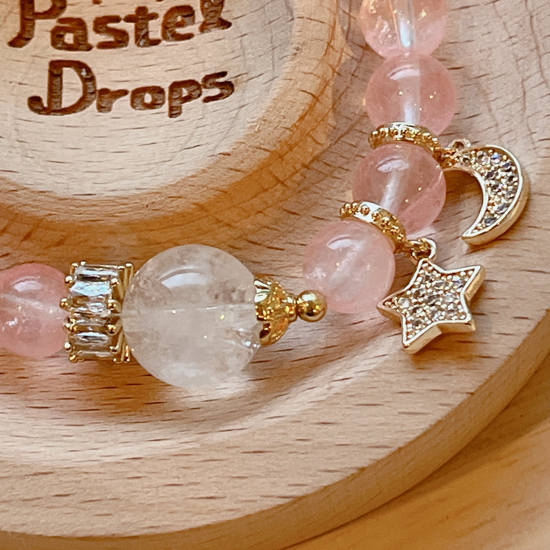 鮮やかなレインボーマニカラン水晶がブレスレット全体を彩り、ピンクトパーズや月、星のデザインが煌めきます。
