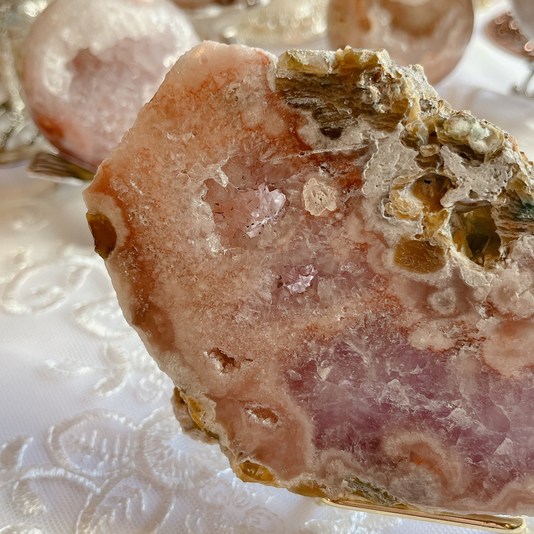 ピンクアメジストに桜瑪瑙のお花、2つのパワーストーンが共生した、美しいプレートスライスです。