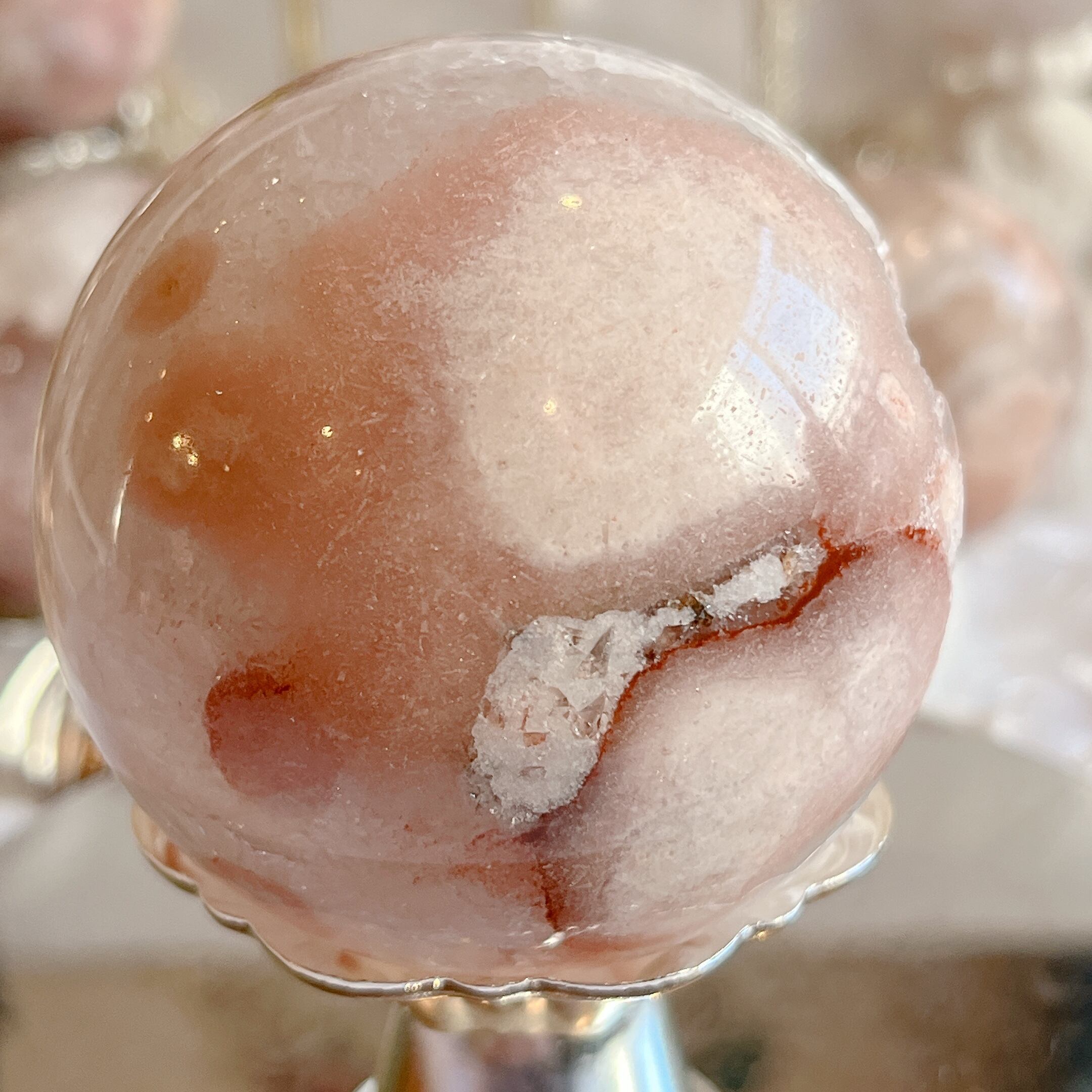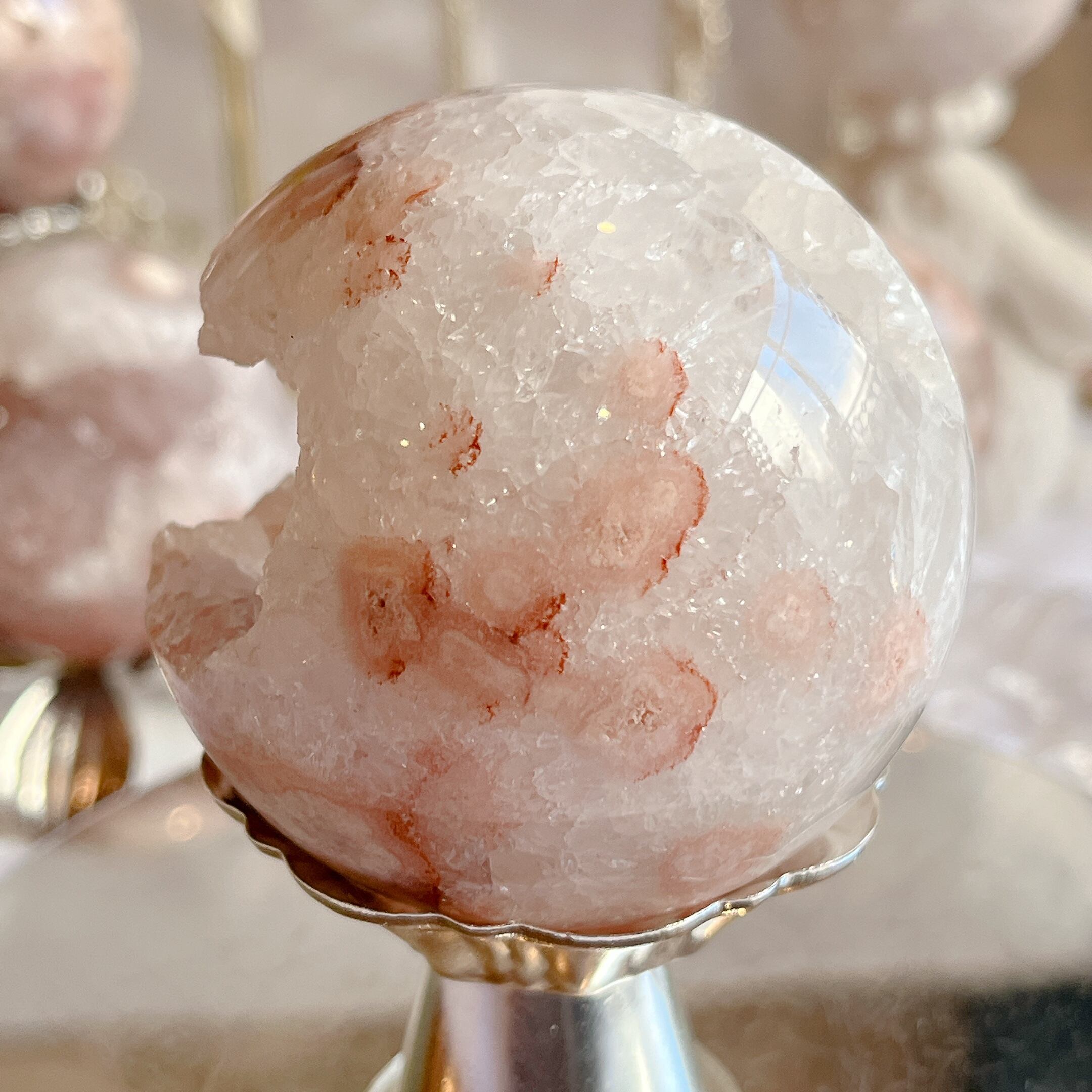 このパワフルなピンクアメジスト共生スフィアを身近に置くことで、自分自身の内面や周囲のエネルギーを浄化し、安らぎとバランスを与えます。