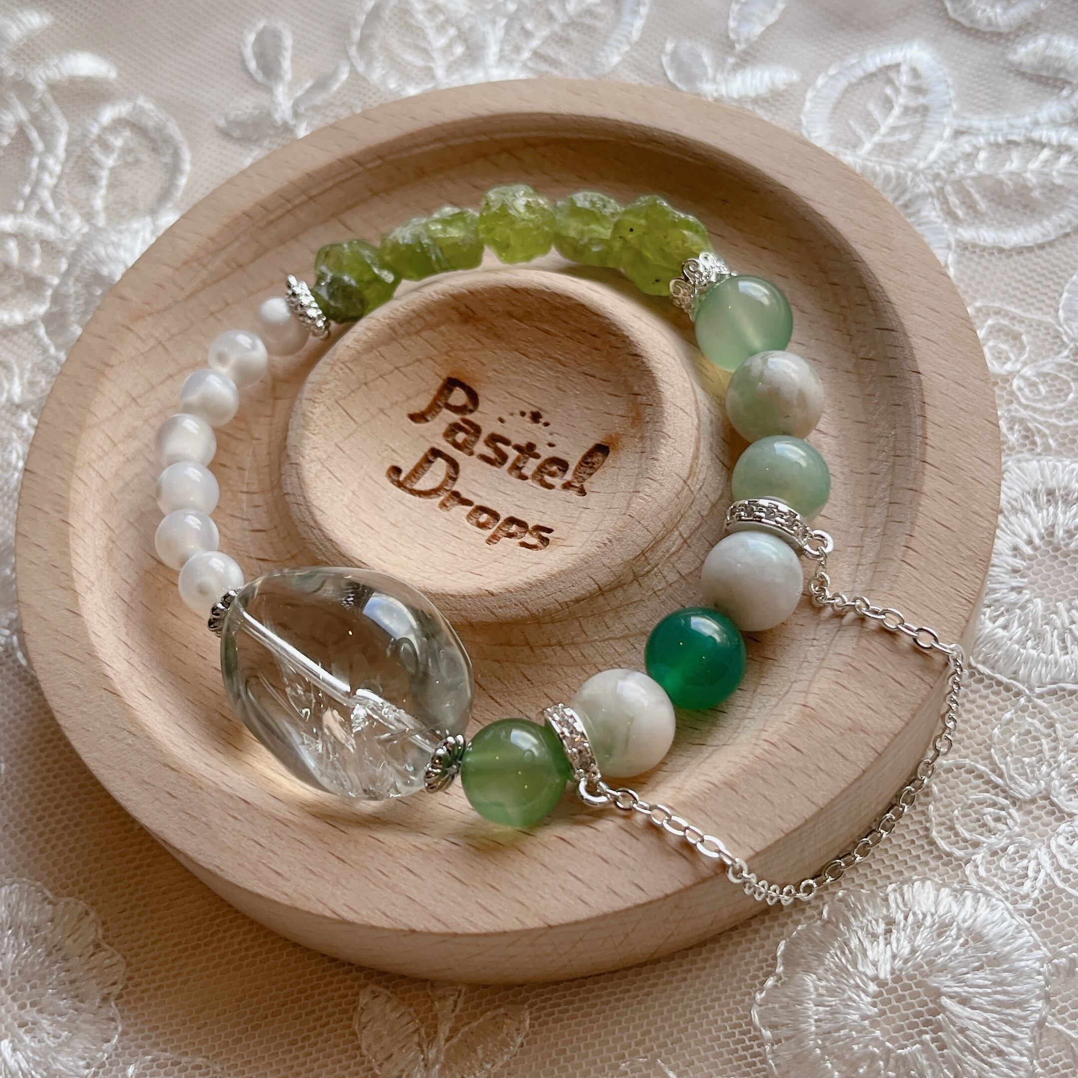 グリーンアメジストのナギット、グリーン桜瑪瑙、ペリドット原石、スノーアゲートなど、さまざまな種類の天然石を組み合わせました。