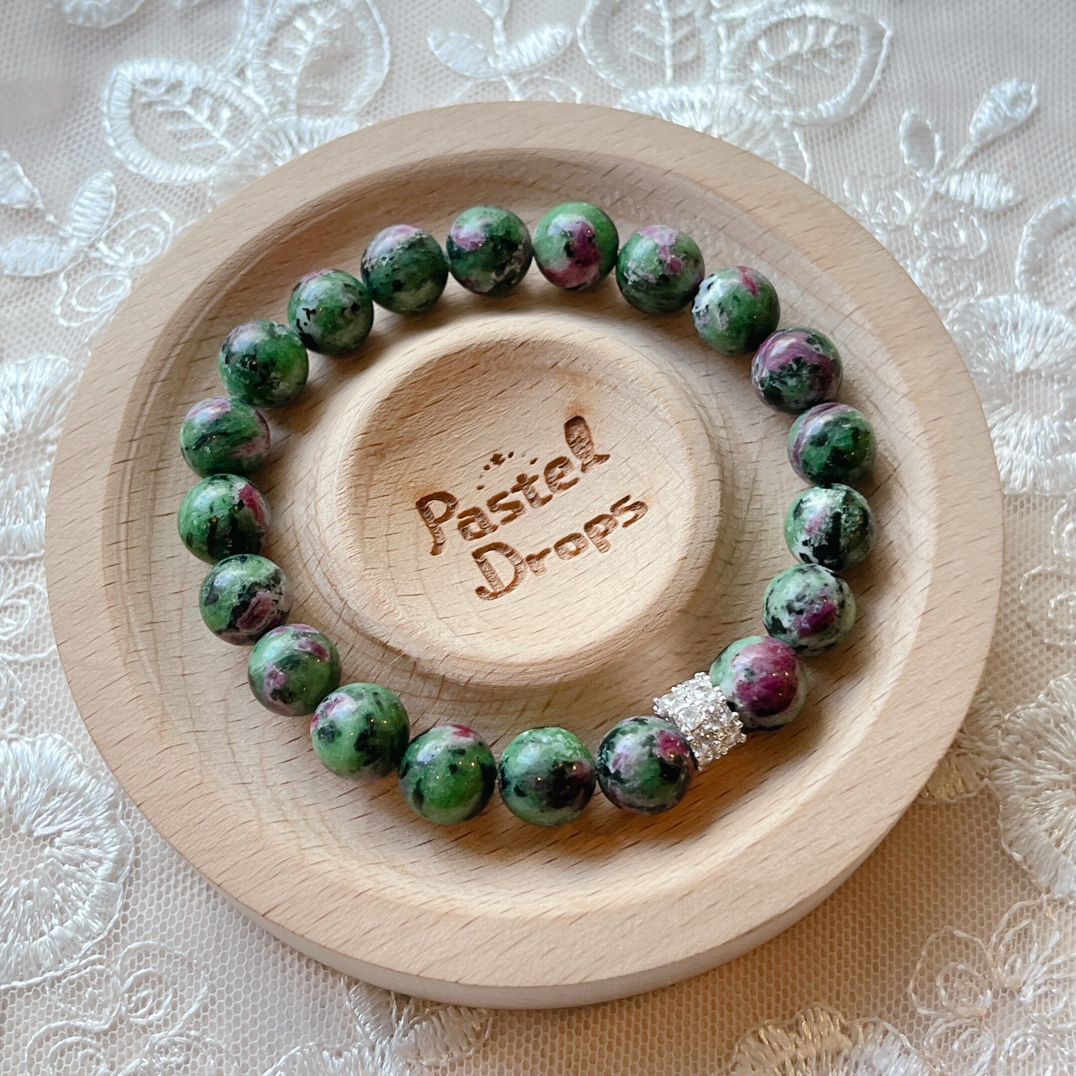 華やかな輝きと深い赤色が美しいルビーインゾイサイトブレスレット。
