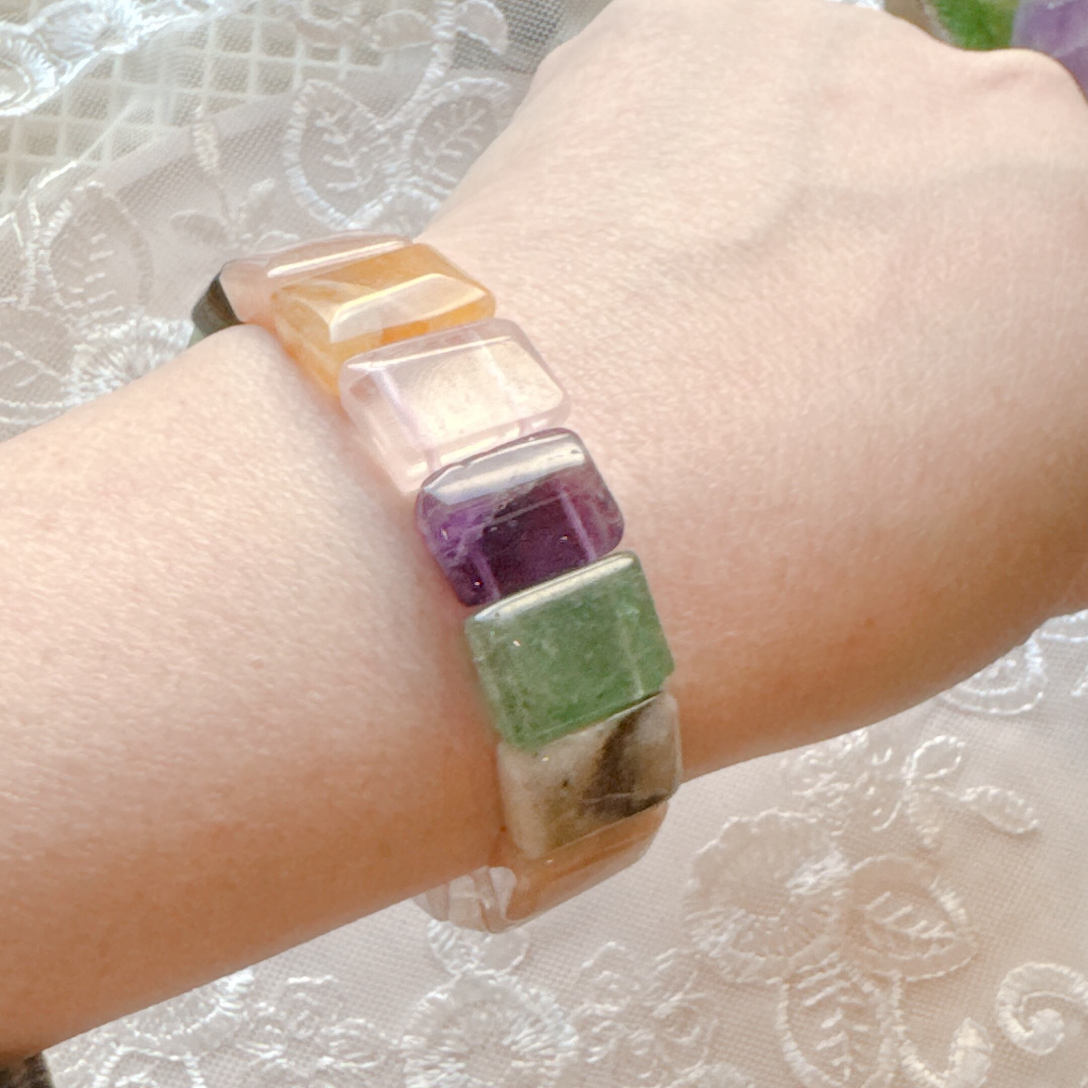 このバングルは、様々なカラーのクォーツ(アメジスト・水晶・シトリン・グリーンストロベリー・ピンクムーンストーン・ジャスパーなど)が贅沢にあしらわれています。