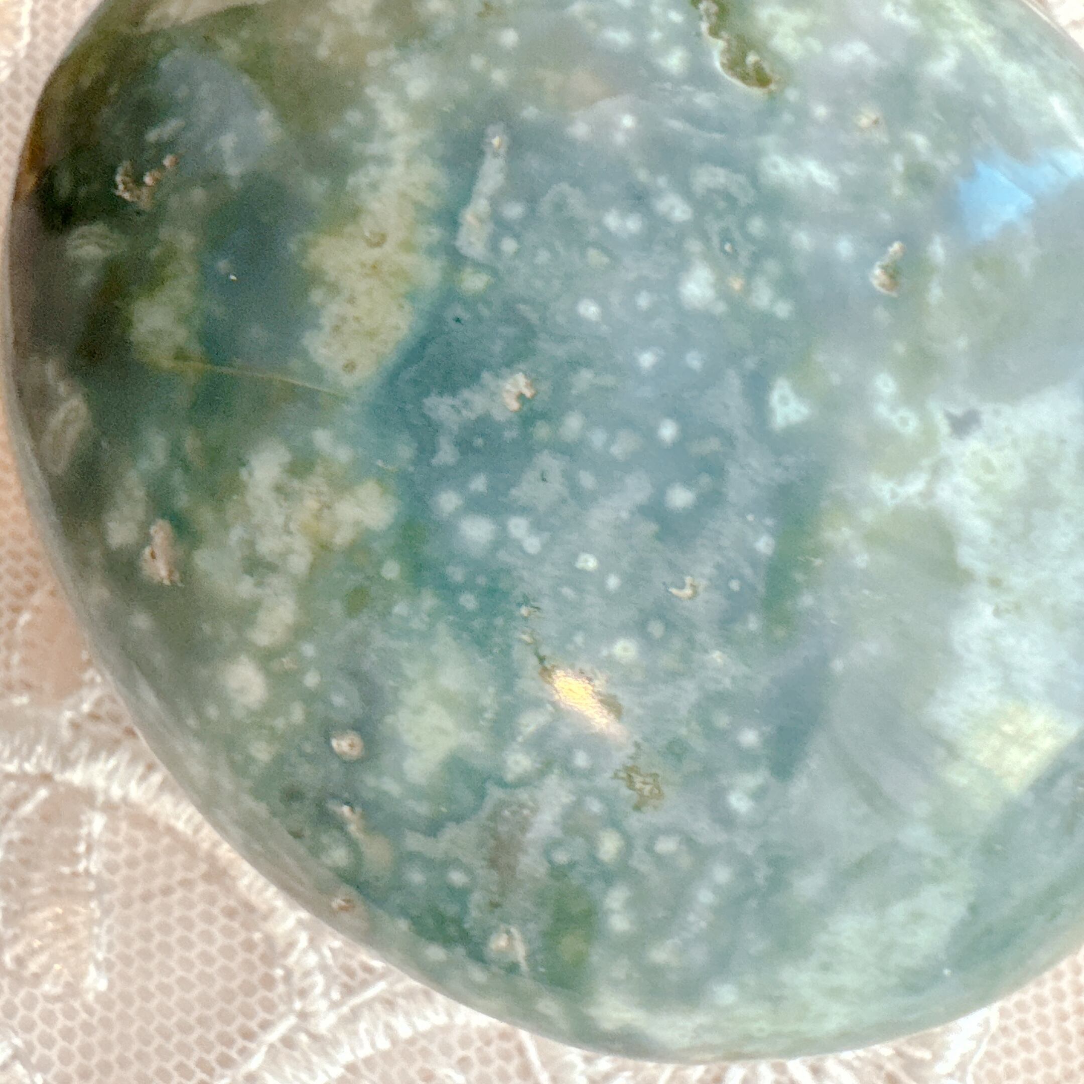 オーシャンジャスパーの特徴である独特の模様は、マグマが火山活動で地上に流れ出し自然に冷え固まる際に、空洞ができその中に石英がしみこむと一緒に流紋岩や、緑泥石などマリモ状の玉が入り込みこの独特の模様ができたと云われています。